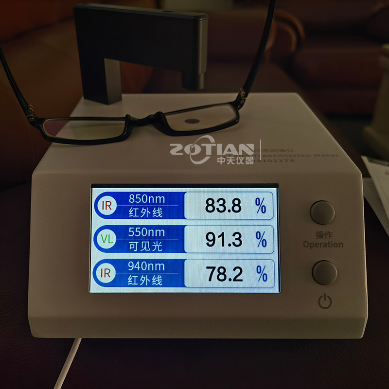 OT-850B鏡片透過率測試儀的測試原理是采用紅外850nm光源,紅外940nm光源和可見550nm光源照射被測透明物質(zhì),感應(yīng)器分別探測三種光源的入射光強(qiáng)和透過被測透明物質(zhì)后的光強(qiáng),透過光強(qiáng)與入射光強(qiáng)的比值即為透過率,用百分?jǐn)?shù)表示。