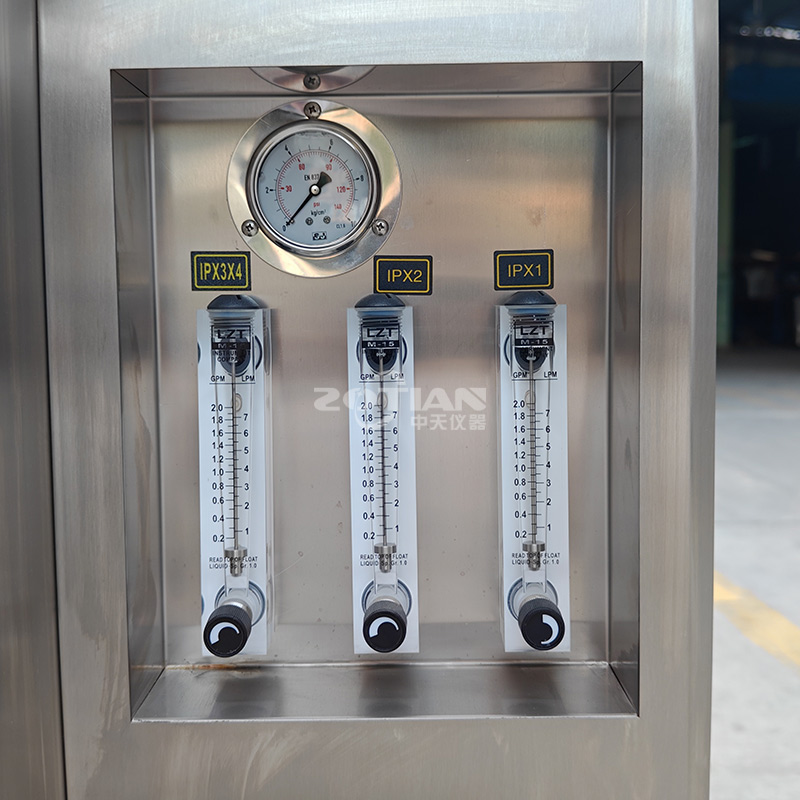 防雨密封性試驗裝置要保證從側(cè)面和頂部方向?qū)Ξa(chǎn)品噴水,避免出現(xiàn)噴水死角,保證噴水壓力、流量對應(yīng)于產(chǎn)品位達到國標(biāo)要求。淋雨框架結(jié)構(gòu)在保證防銹,防震的同時做到簡潔美觀,整個設(shè)備操作簡單,便于零部件的檢修和維護。